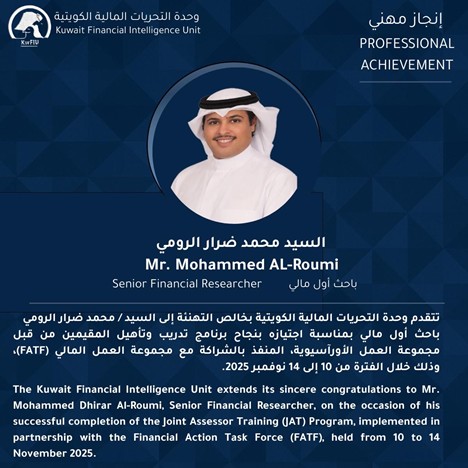 تتقدم وحدة التحريات المالية الكويتية بخالص التهنئة إلى السيد / محمد ضرار الرومي.